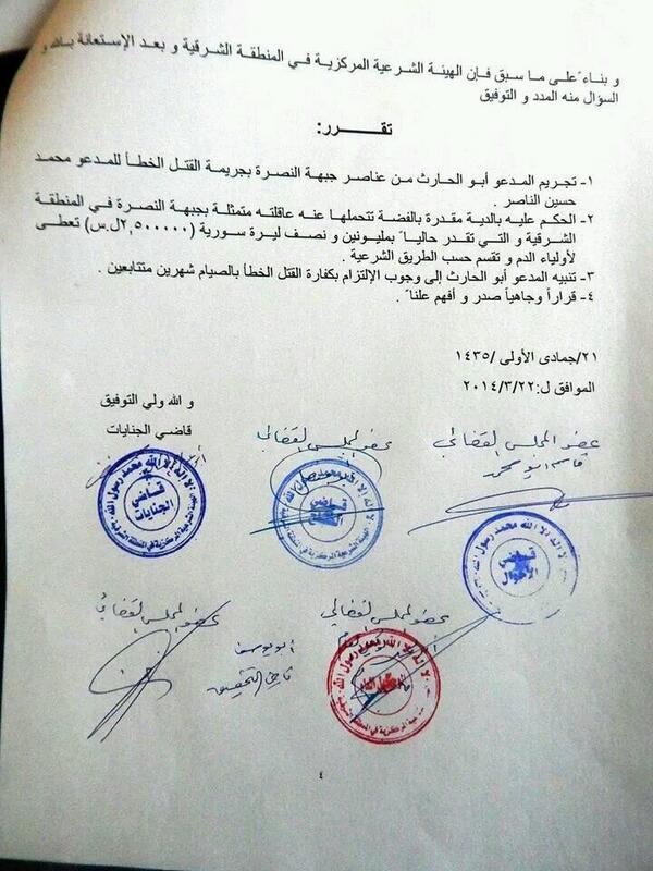 اعدام اربعة جواسيس علي يد جيش الاسلام بريف دمشققالت مصادر ان عناصر عسكرية تابعة لجيش الإسلام المقاتل تحت راية الجبهة الإسلامية نفذوا منذ يومين حكم الإعدام بحق أربعة أشخاص في ساحة عامة من مدينة دوما بريف دمشق.حيث تلا أحد العناصر العاملة في سجن التوبة التابع لجيش الإسلام سبب إعدام الأربعة أمام المدنيين الذي اجتمعوا في الساحة، ناسبا إلى المعدمين جريمة "التجسس لصالح النظام وأعوانه".ثلاثة من الذين تم إعدامهم مدنيون، اثنان منهم من مدينة دوما وواحد من درعا، بينما الرابع عسكري من مدينة حمص كان قد انشق عن جيش النظام وانضم إلى جيش الإسلام.