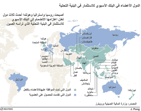 لقاء سابق جمع ممثلي الدول المشاركة برأسمال البنك مع الرئيس الصينقالت وزارة المالية الصينية، اليوم الثلاثاء، إن السعودية وطاجيكستان ستنضمان إلى 24 دولة أخرى مؤسسة للبنك الآسيوي للاستثمار في البنية التحتية الذي تدعمه بكين.وذكر بيان على الموقع الإلكتروني لوزارة المالية أن عدد الدول المؤسسة للبنك البالغ رأسماله 50 مليار دولار يرتفع إلى 26 دولة، بعد انضمام السعودية وطاجيكستان. وقالت الصين إن بقية الدول المؤسسة للبنك وافقت على انضمام الدولتين بالإجماع.وجرى الإعلان عن تدشين البنك في بكين في أكتوبر، لكنه لايزال تحت الإنشاء. وقال محللون إن الولايات المتحدة تعتبره منافسا للبنك الدولي والبنك الآسيوي للتنمية اللذين يهيمن عليهما الغرب، وهو ما قد يقلص النفوذ الاستراتيجي الأميركي في المنطقة.وامتنعت بعض الدول الكبرى في منطقة آسيا والمحيط الهادي، ومن بينها أستراليا وكوريا الجنوبية، عن الانضمام للبنك الذي يهدف لتقديم قروض إلى الدول النامية لتمويل مشروعات. وستكون الصين أكبر مساهم في البنك بحصة تصل إلى 50 بالمئة.