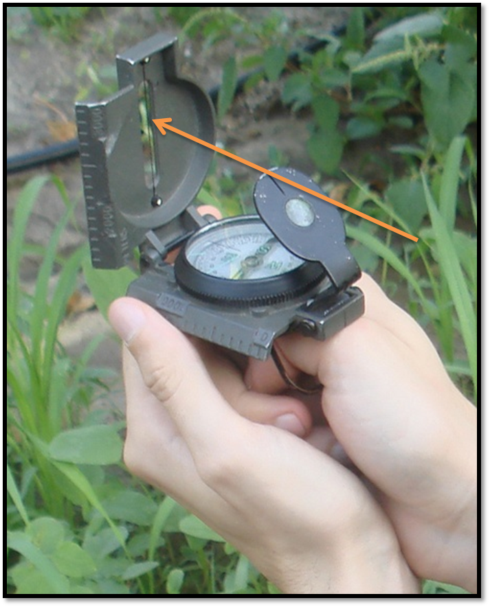 •طريقة التسديد بالبوصلة عن طريق مسكها بشكل أفقي وفتح الغطاء بزاوية 90 درجة مع تثبيتها بحلقة الإبهام وإمالة حامل العدسة بزاوية 45 درجة والنظر إلى الشعيرة من الفرضة الموجودة في الحامل حتى تكون باتجاه الهدف ونقرأ الزاوية بالعدسة المكبرة من صفحة التدريج.
