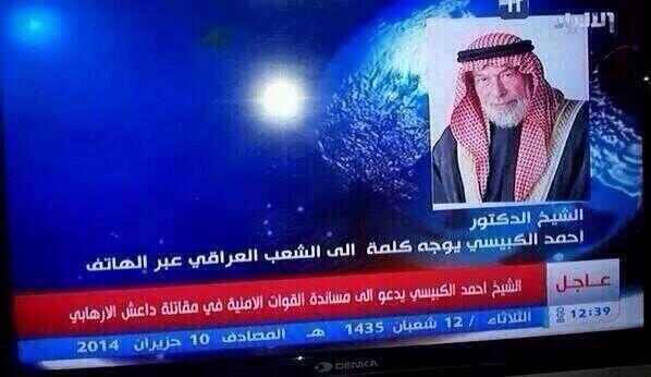 رجل الدين العراقي احمد الكبيسي رئيس قسم الدراسات الأسلامية بجامعة الأمارات وصاحب الظهور الدائم على القنوات الرسمية الأماراتيه يدعو الى القتال لجانب القوات التابعه لنوري المالكي